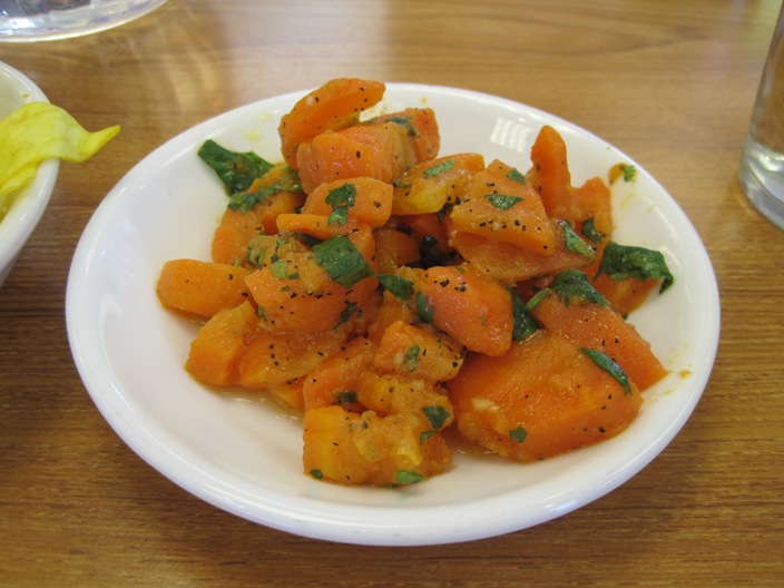 Although takeout is popular, we were eating here. So, they brought our table some complimentary Israeli appetizers (aka Israeli banchan) consisting of carrots, kosher pickles, pickled vegetables and coleslaw. None of them particularly stood out for me but maybe I just haven’t developed a taste for them.